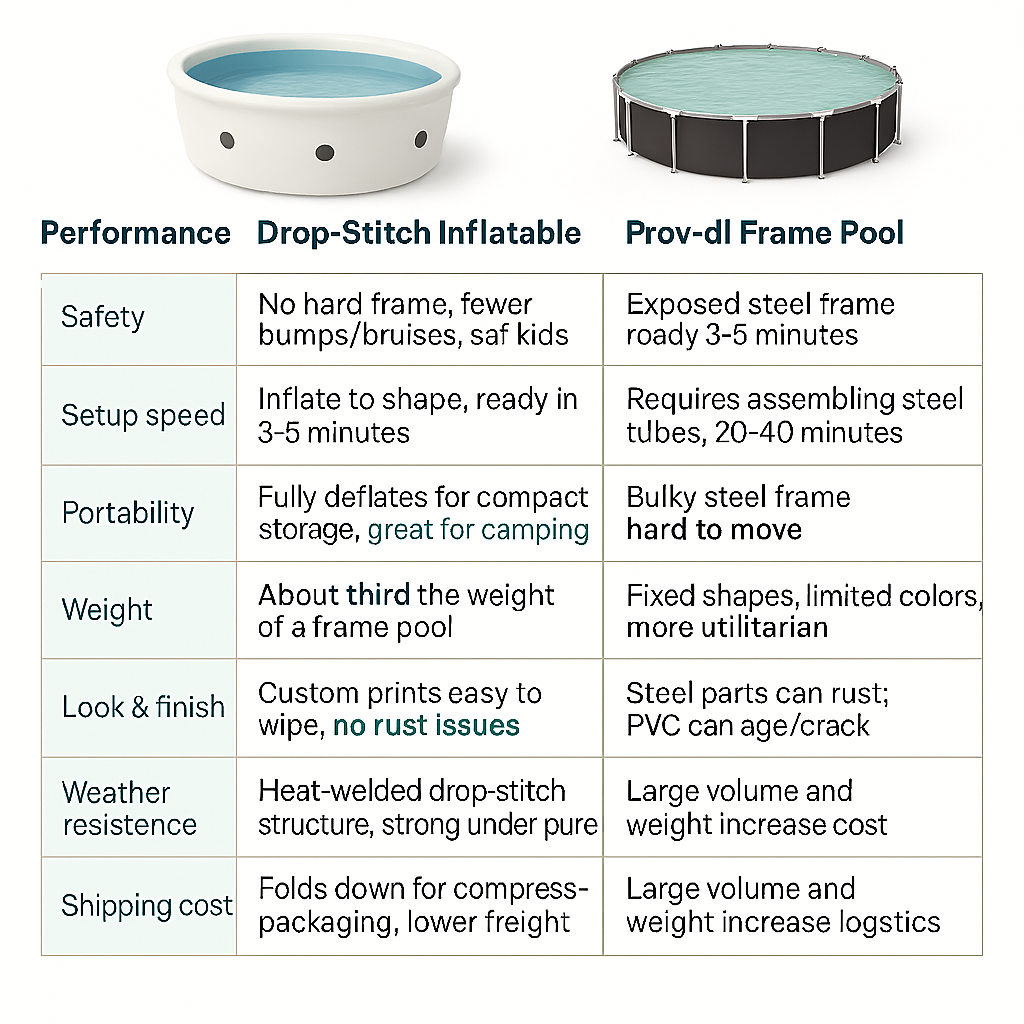 Built with reinforced seams and double-stitched drop-stitch fabric, these pools are designed for long-lasting performance. This material structure holds pressure evenly and increases puncture resistance compared to standard inflatables.Β